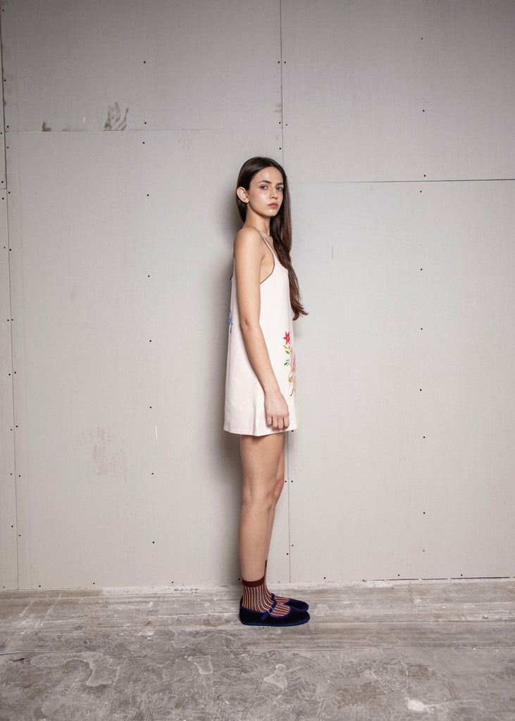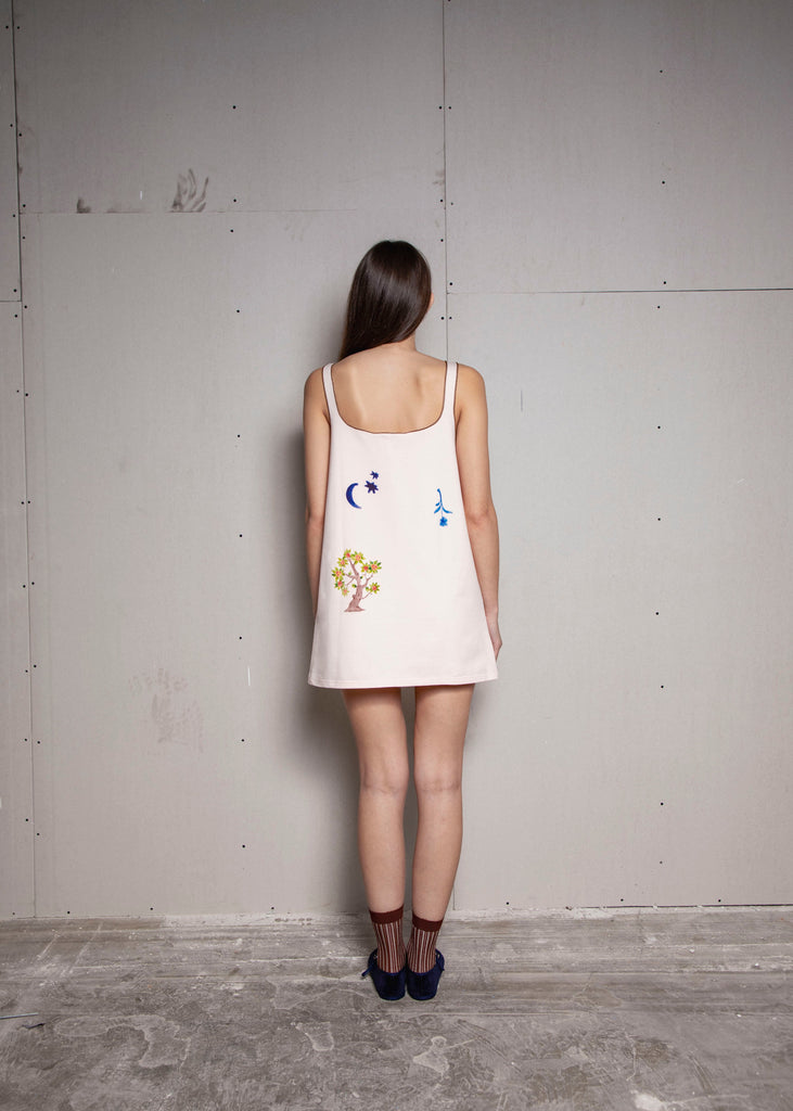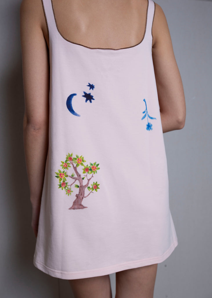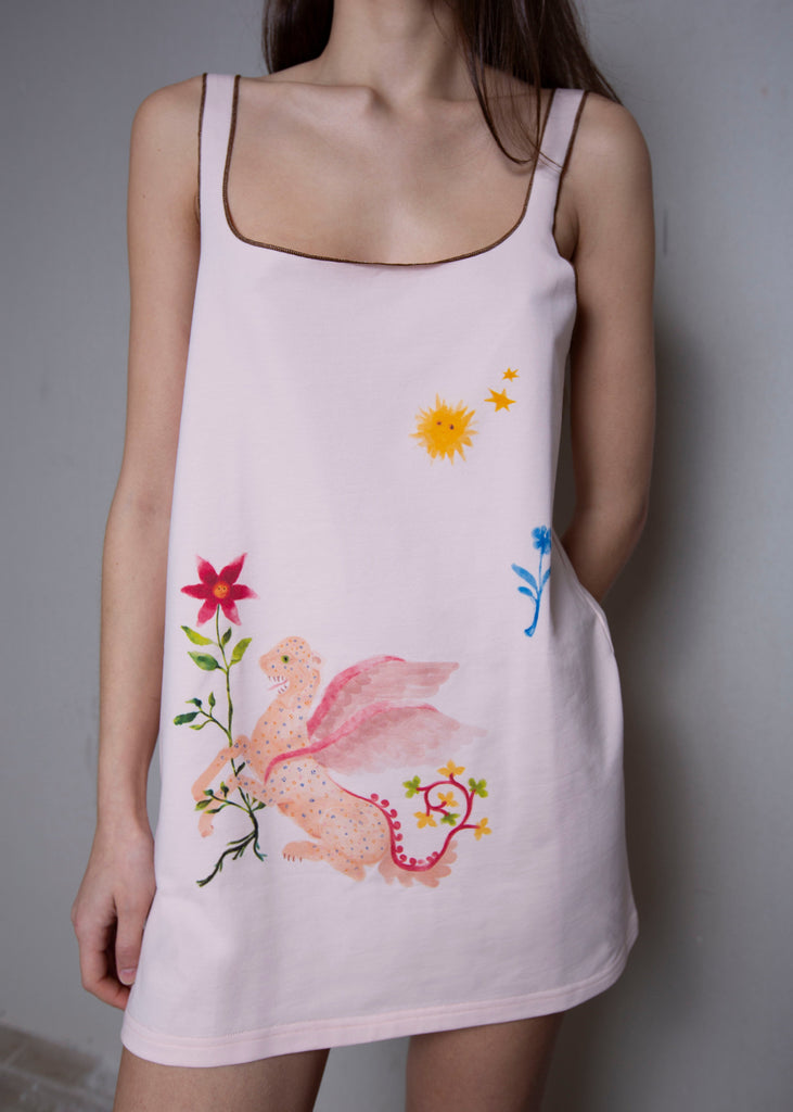 60s shaped trapezoid mini dress in cotton jersey; edges embroidered in a brown overlocking stitch, digitally printed with a design inspired by medieval and persian illustrations.