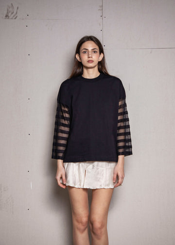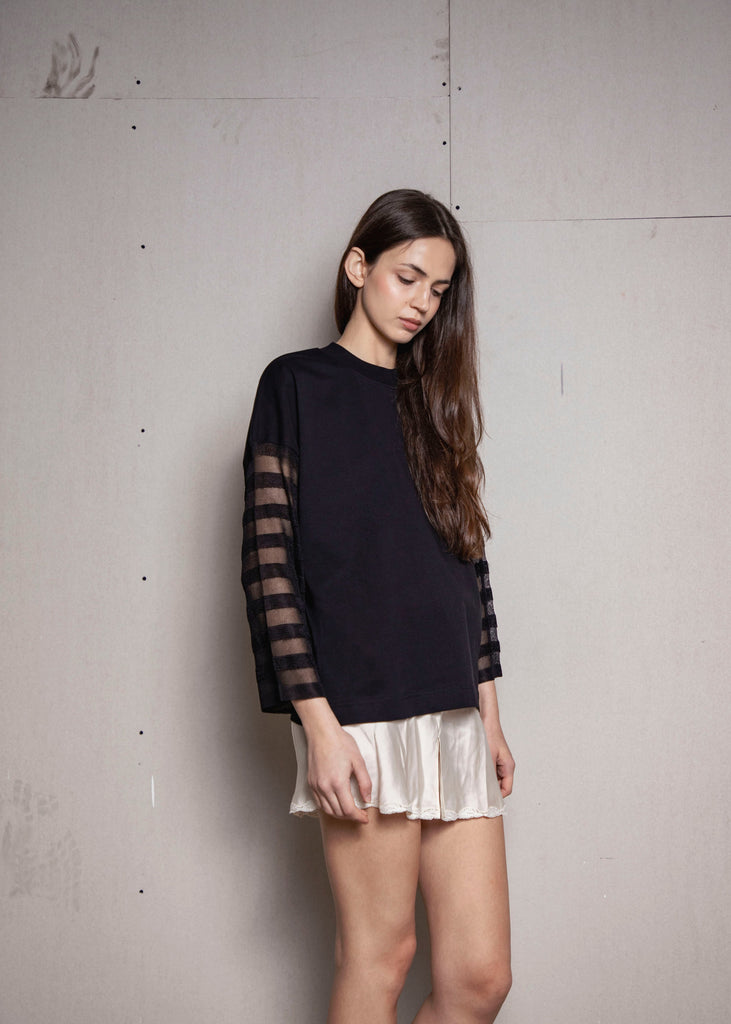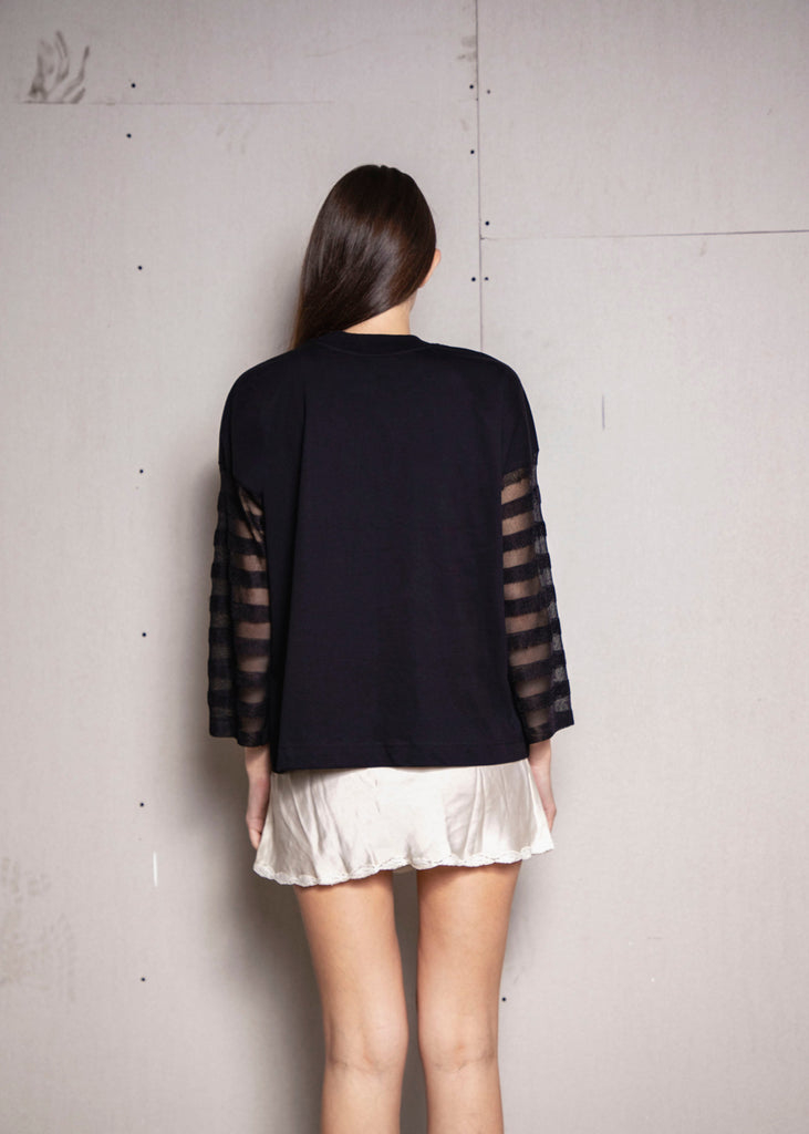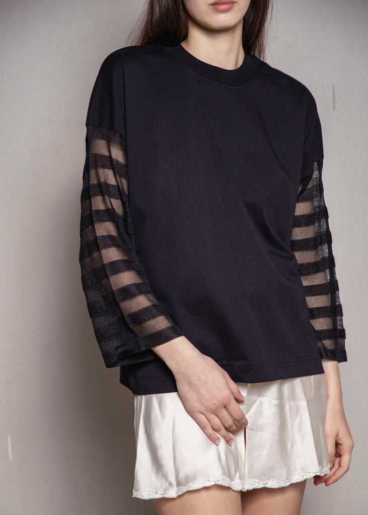 Body made of t-shirt with a wide rib neck collar. Viscose sleeves knitted in a devoré effect, conveying a sheer and flowy effect.
