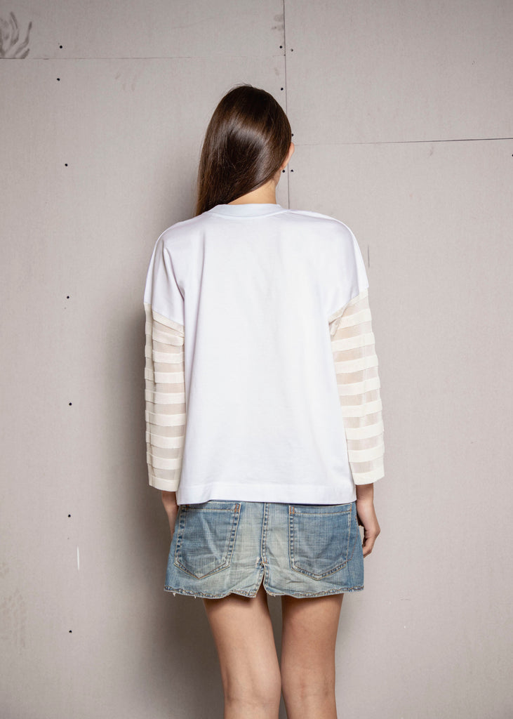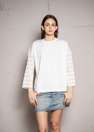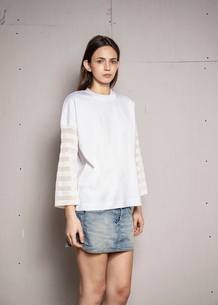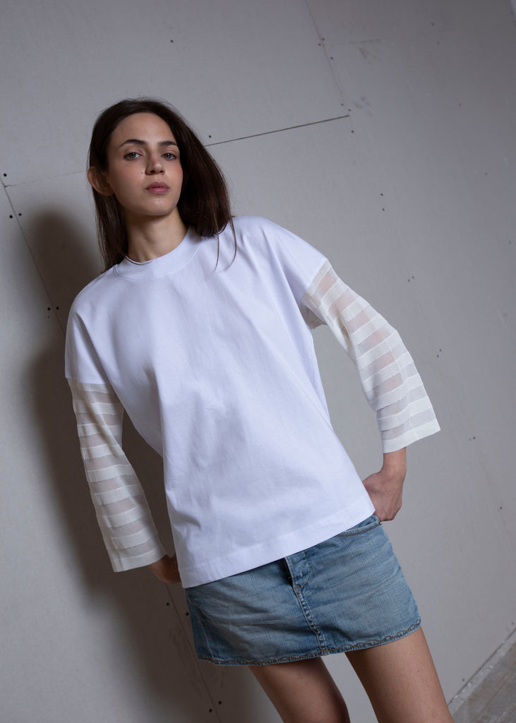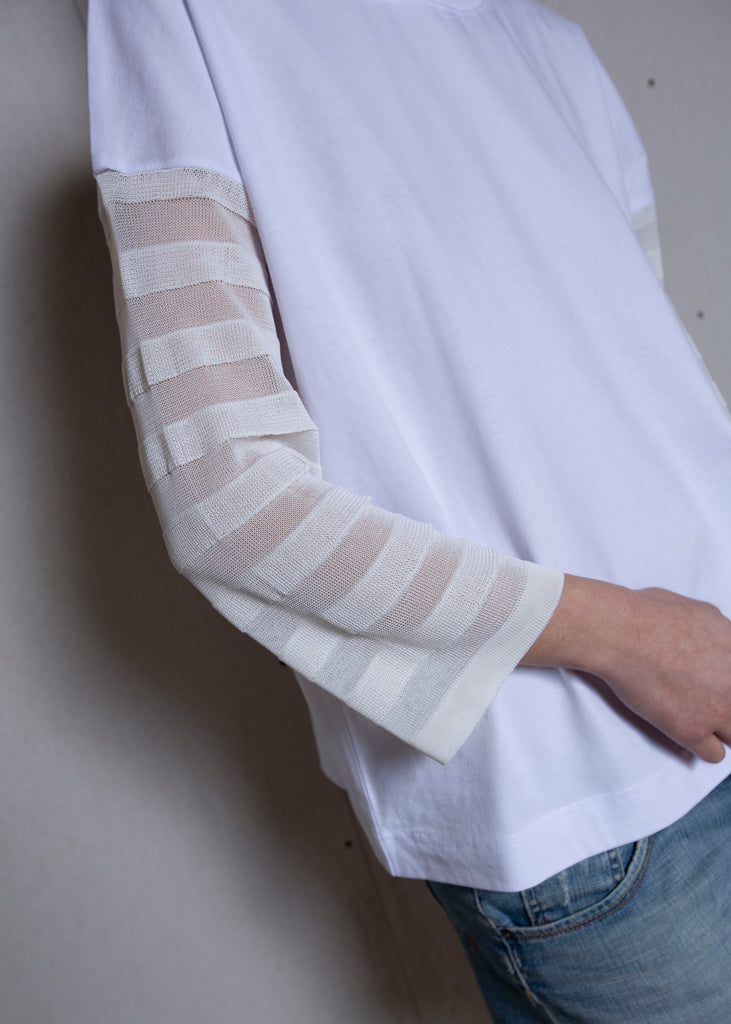 Body made of t shirt with a wide rib neck collar. Sleeves knitted alternating tensions in a shiny viscose, conveying a sheer and flowy effect.