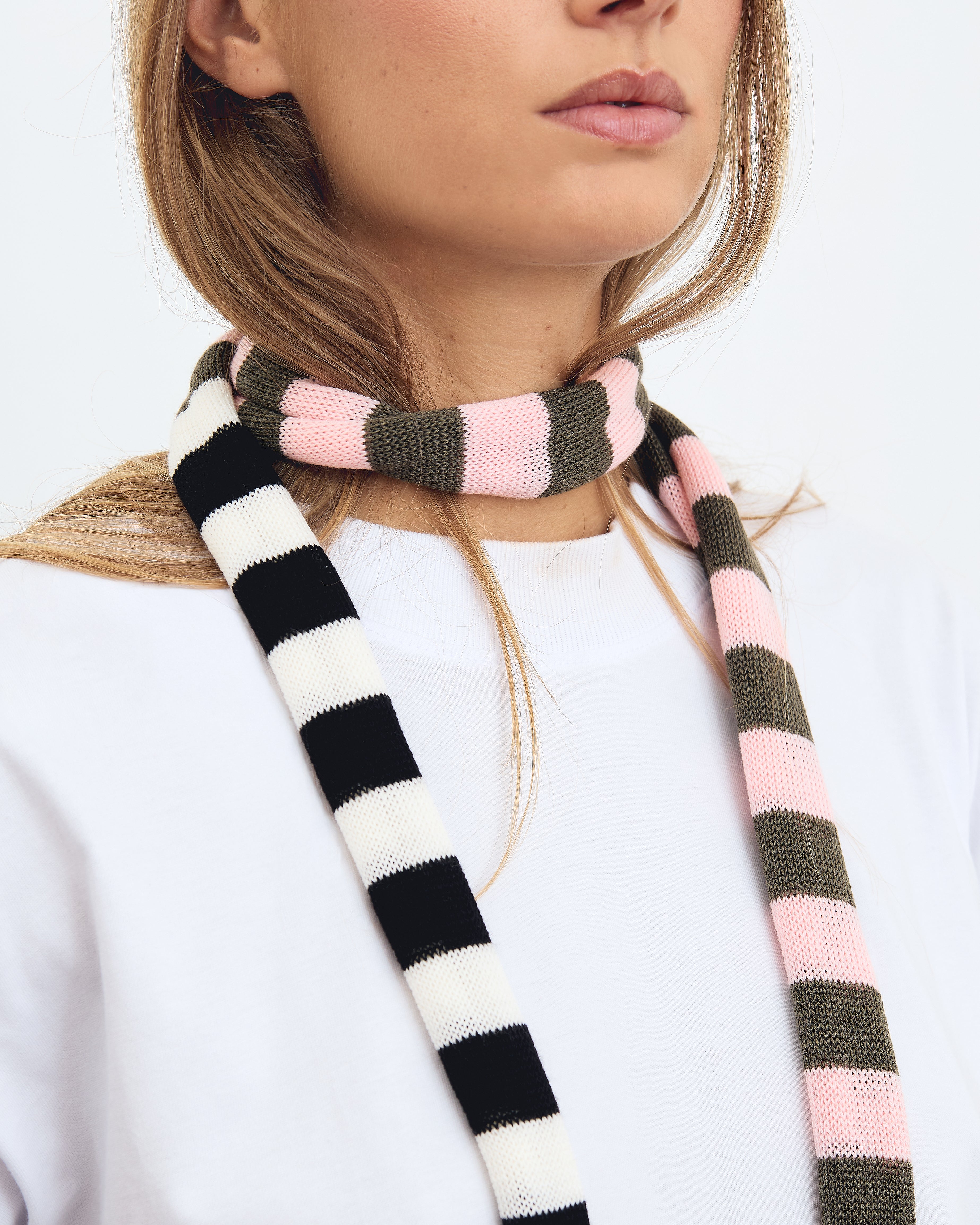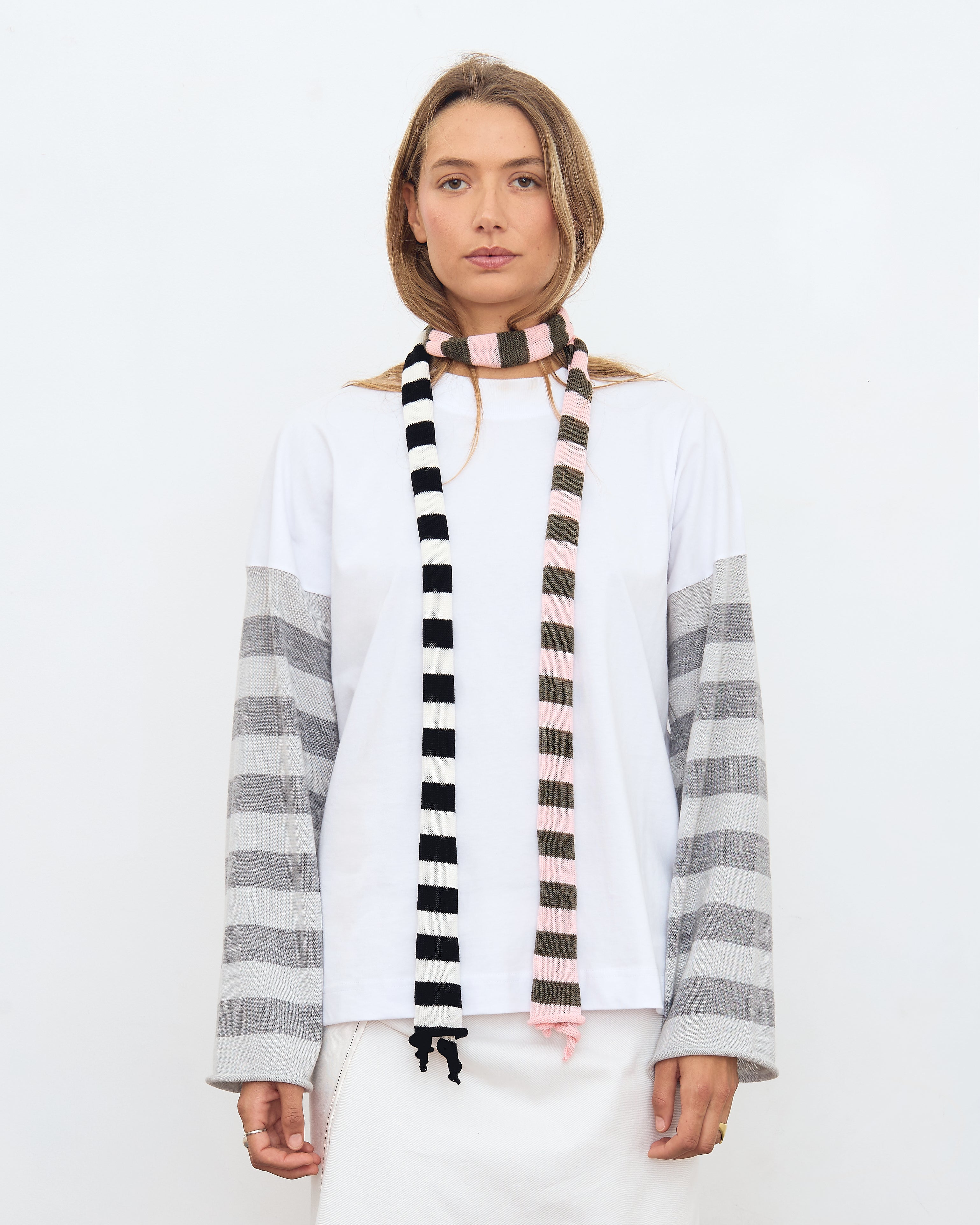 The X Scarf is extra long and slim; the yarn is 70% merino wool, 20% silk and 10% cashmere.