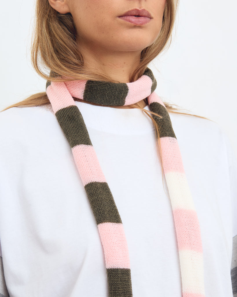 The X Scarf is extra long and slim; the yarn is 70% merino wool, 20% silk and 10% cashmere.